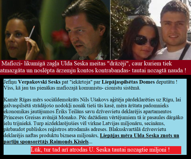 Tas ir labi, kad pieteicas sabiedrībai kāds jauns cīnītājs par TAISNĪBU UN LIKUMĪBU ! Šajā i- vietnē daudz ir rakstīts par Liepājas noziedznieku karteli, kuru pārstāv “mūžīgais” Liepājas mērs(galva) U. Sesks. Seska vieta nav tikai aiz restēm, bet “pie sienas”. Uz viņa sirdsapziņas ir daudzu cilvēku asinis- proti, dzīvības. Aiz viņa stāv Rīgas mafija ar bijušajiem čekistiem priekšgalā, bet šīs ķēdes gals noslēdzas Tel- Avivā. Liepājas saziņas līdzekļi visi kalpo mafijai. Ja kāds iedomājas “būt patstāvīgs”, tas tiek aizraidīts “pa skuju taku”. Tādi kā žurnālists G. Matīs, policists N. Dīķis, reketieris G. Dubrovenko, “kurzemes vārds” žurnalists E. Lūsēns… tie ir tikai manis zināmie, bet cik ir tādu, kuri nav zināmi… !? Pret mafiju gribēja cīnīties arī policists Aivars Prūsis, kanapi izmuka no likvidācijas, jo aizmuka uz Angliju. Vēlāk, nezin kā, bet savus “grēkus” izpirka. Viņa dēls Aigars Prūsis pat pārgāja Seska komanda un abi uzstājās pret mani.
